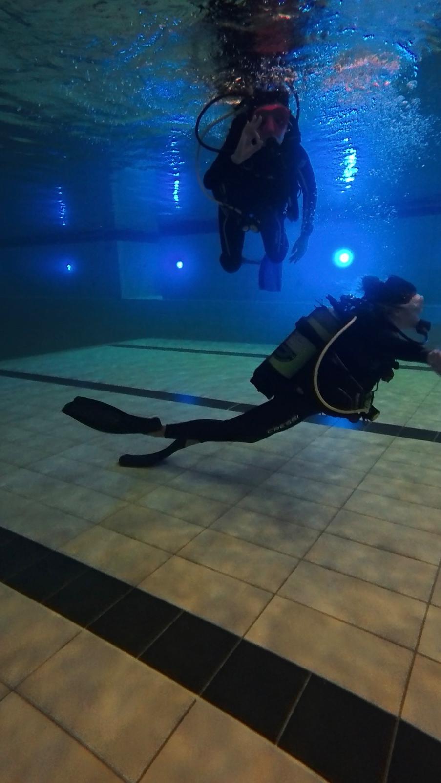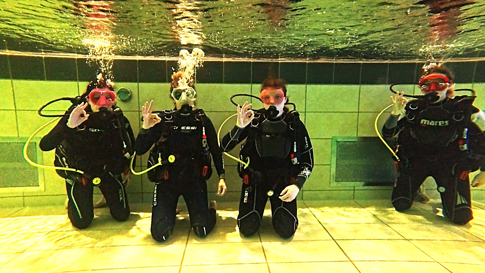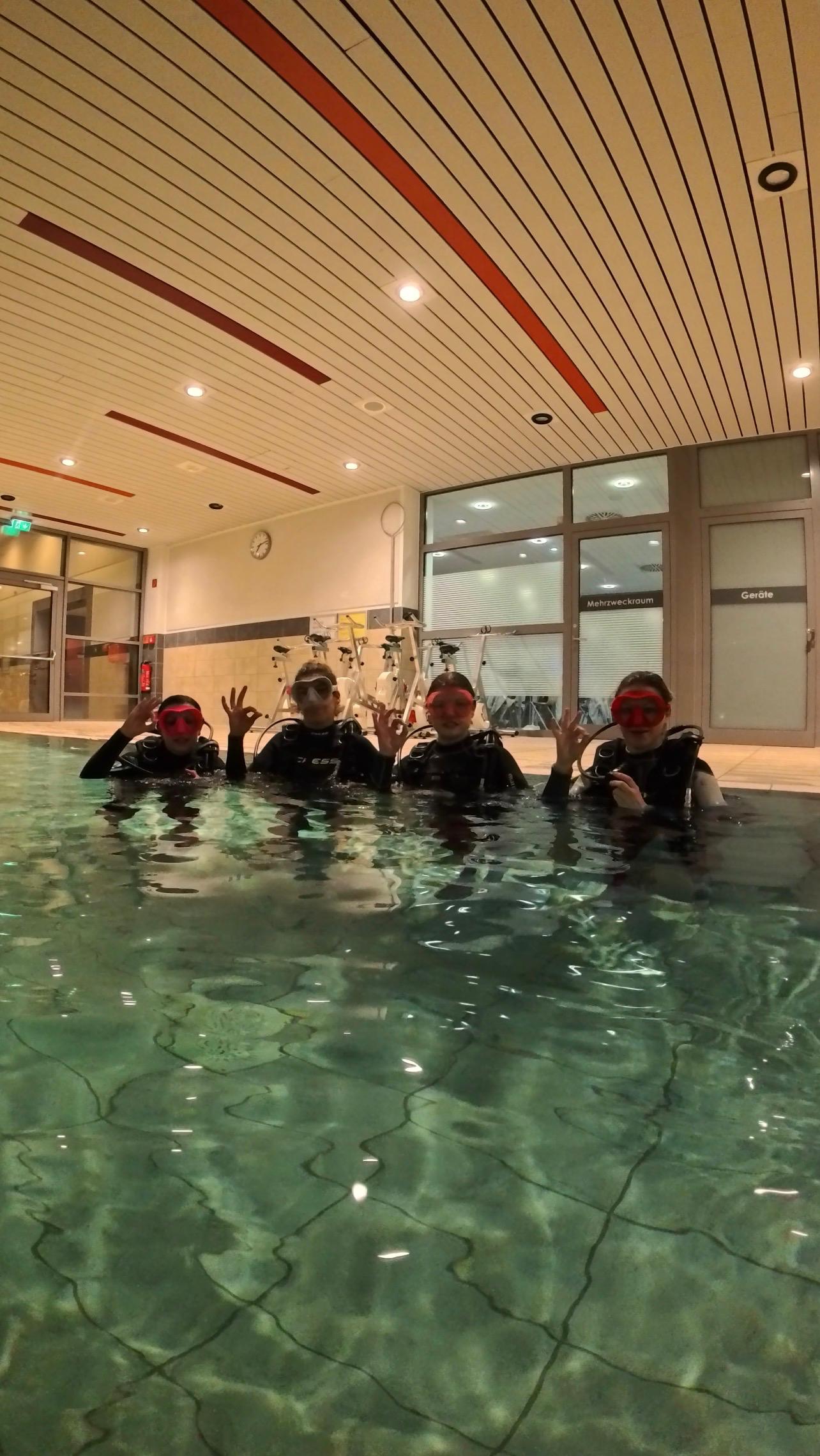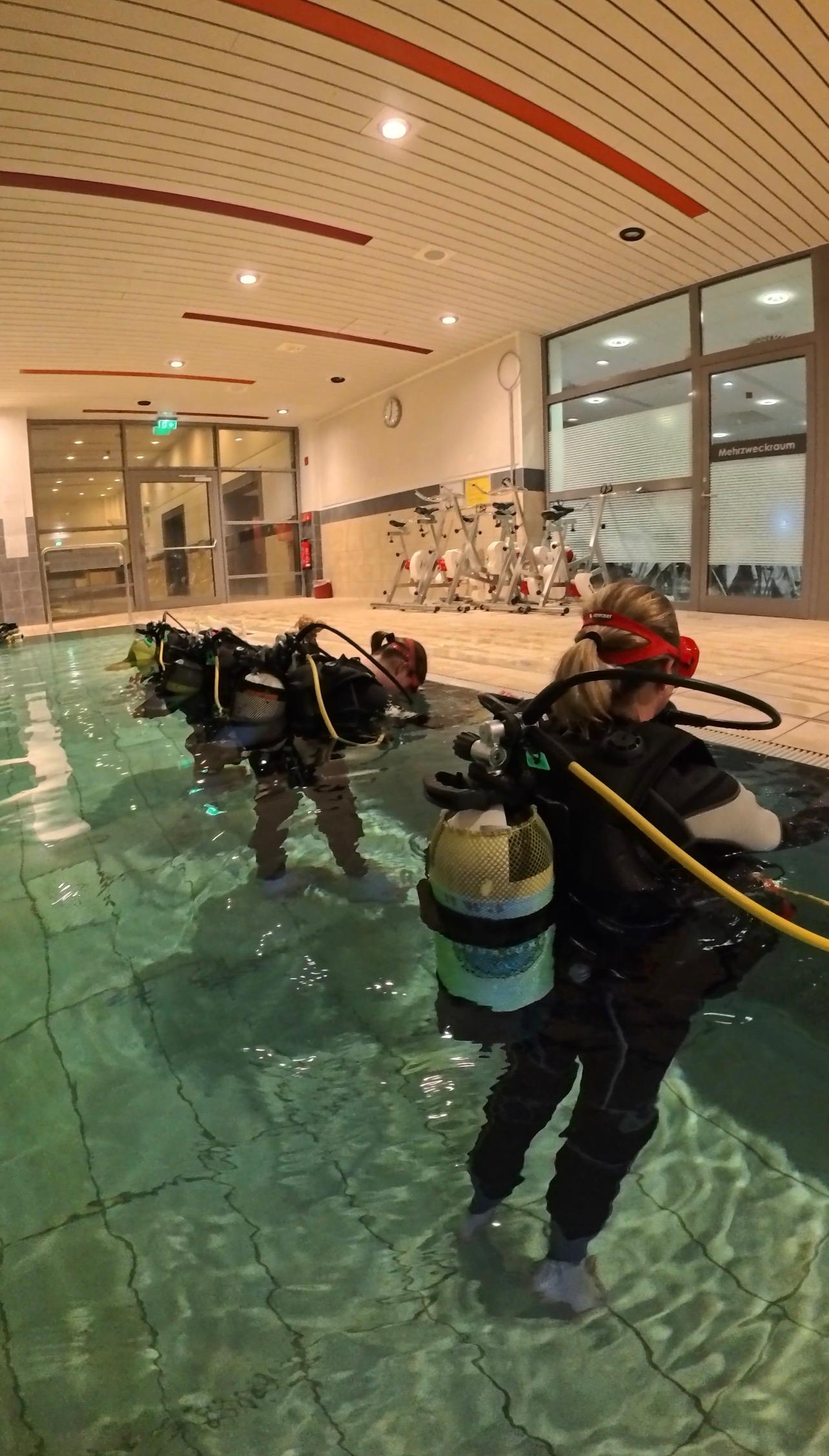 Mit dem PADI eLearning konnten Lea Marleen, Michaela, Seval und Simone ganz entspannt in die Grundlagen des Tauchens eintauchen. So waren alle bestens vorbereitet, als wir uns um 17:30 Uhr im Bünte Bad zum praktischen Teil trafen. Alle bestens vorbereitet und neugierig auf das, was im Wasser auf sie wartet.